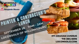 Wednesday September 28, 2022, 7 am – 10 am Join us at Loconsolo of Williamsburg for our contractor’s lunch! Grab a mid-day meal while you shop for paint and supplies. Ask our Benjamin Moore rep about new products or one of our friendly paint professionals for assistance.
