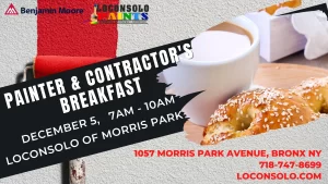 Wednesday August 3, 2022, 7 am – 10 am Join us at Loconsolo of Morris Park for our contractor’s breakfast! Grab breakfast while you shop for paint and supplies. Ask our Benjamin Moore rep about new products or one of our friendly paint professionals for assistance.