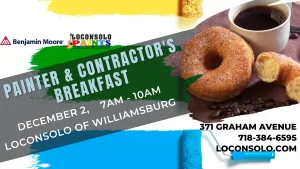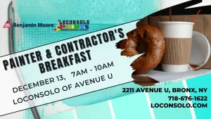 Tuesday, September 20, 2022, 7 am – 10 am Join us at Loconsolo of Avenue U for our contractor’s breakfast! Grab breakfast while you shop for paint and supplies. Ask our Benjamin Moore rep about new products or one of our friendly paint professionals for assistance.