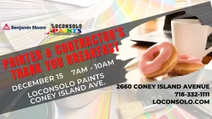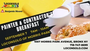 Wednesday September 7, 2022, 7 am – 10 am Join us at Loconsolo of Morris Park for our contractor’s breakfast! Grab breakfast while you shop for paint and supplies. Ask our Benjamin Moore rep about new products or one of our friendly paint professionals for assistance.